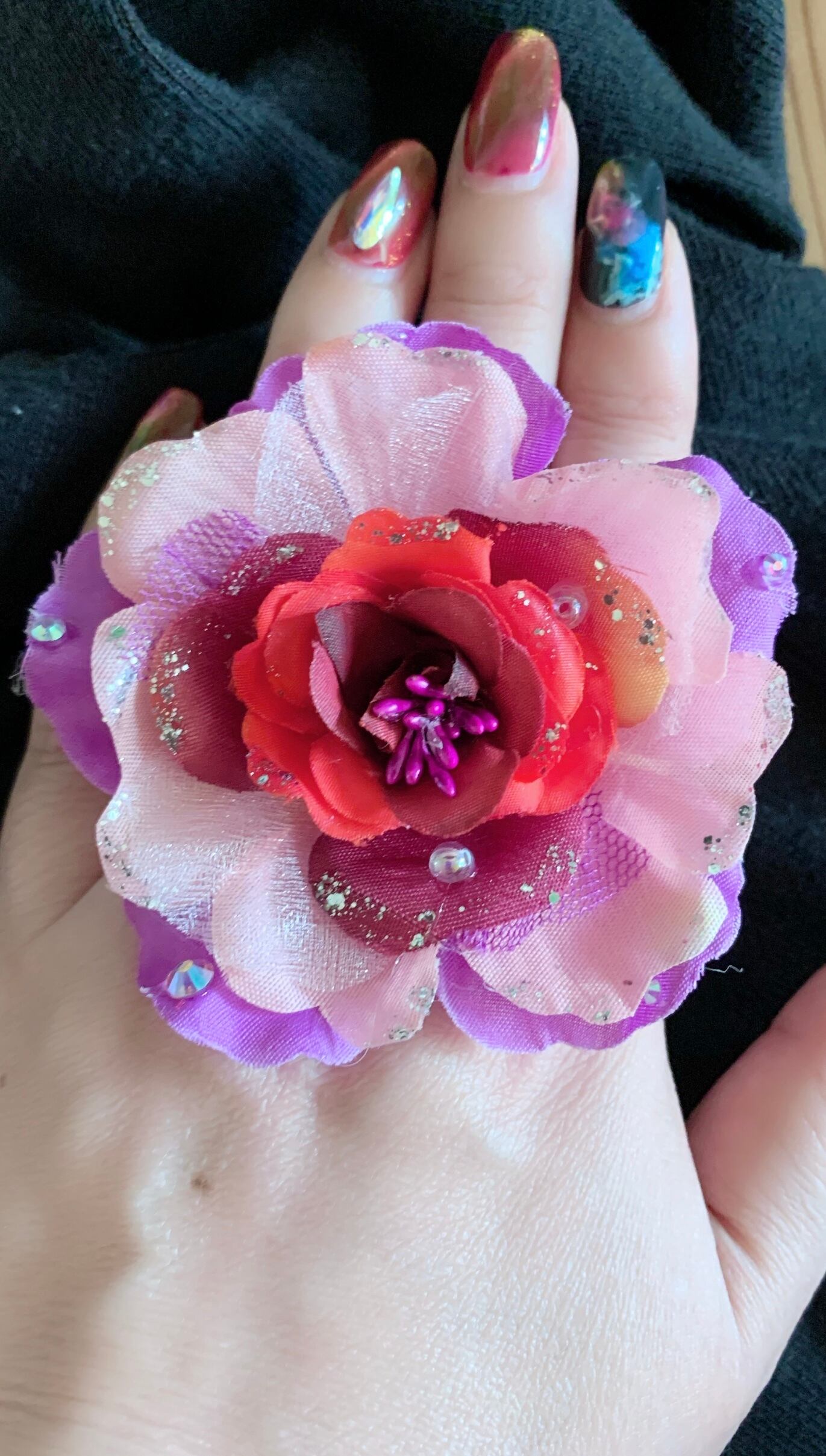 カラフルフラワーパーツ、チュール、オーガンジー、ラメ、ビーズ、オーロラストーンなど、それぞれに組み合わせ。