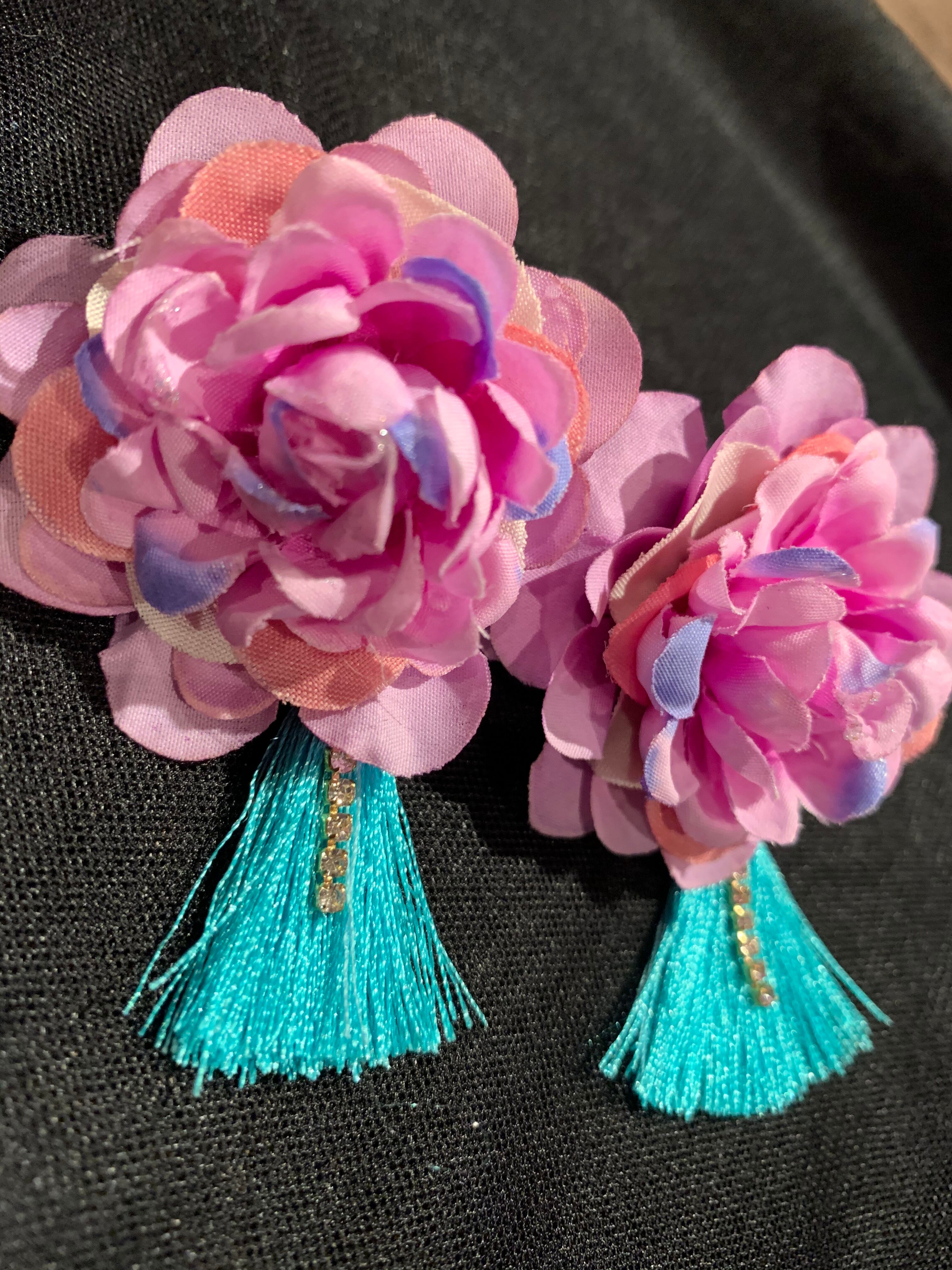ピンクに青紫がチラリのお花に鮮やかな水色タッセルを合わせて。