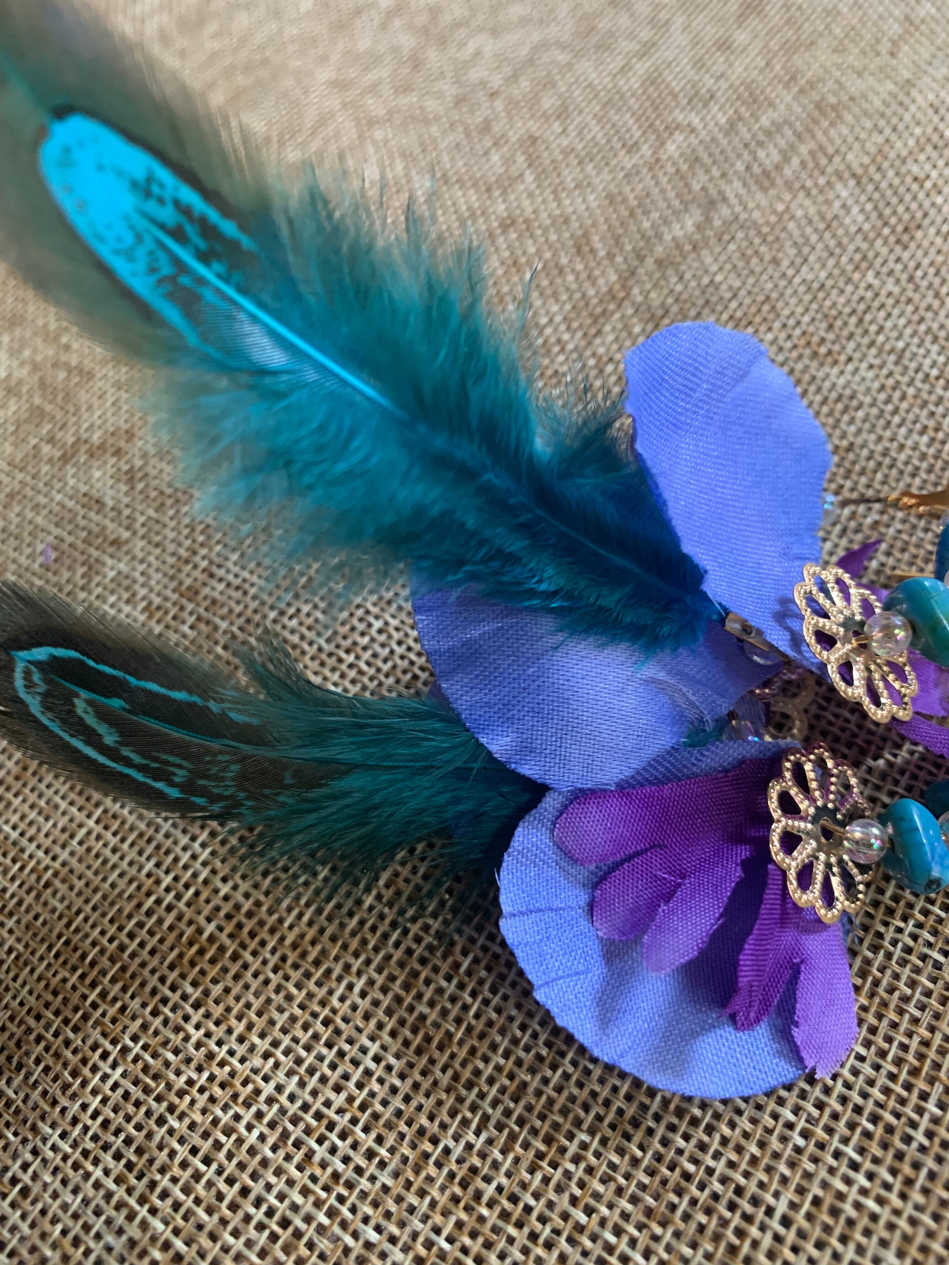 ブルー系とパープルカラーのフラワーパーツ、透かしパーツ、ブルーカラーのフェザーがアクセント。