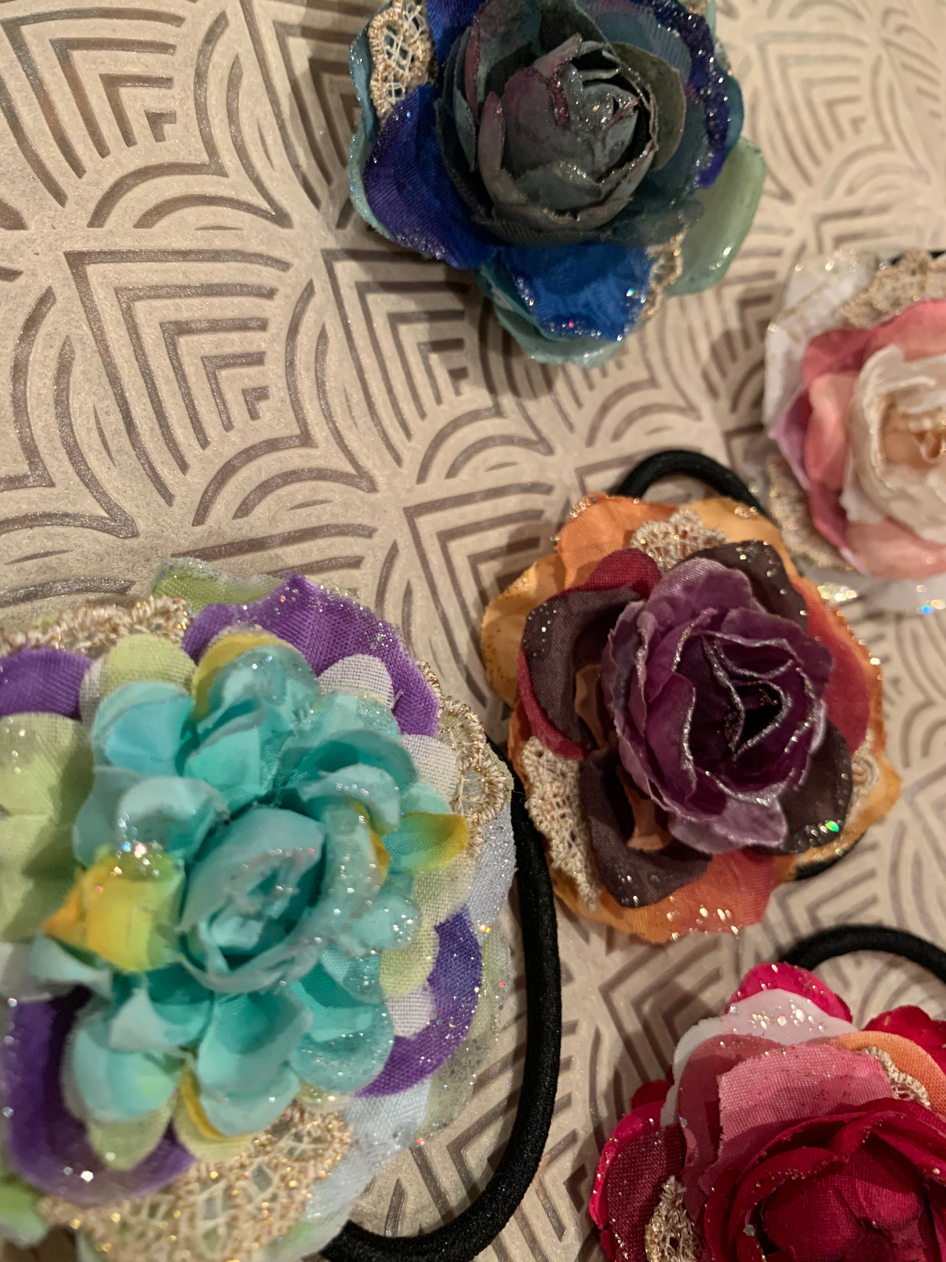 ヘアゴム、ブレスレット、ストール留め、ヘアーアクセサリー、ハンドメイド、カラフルフラワー