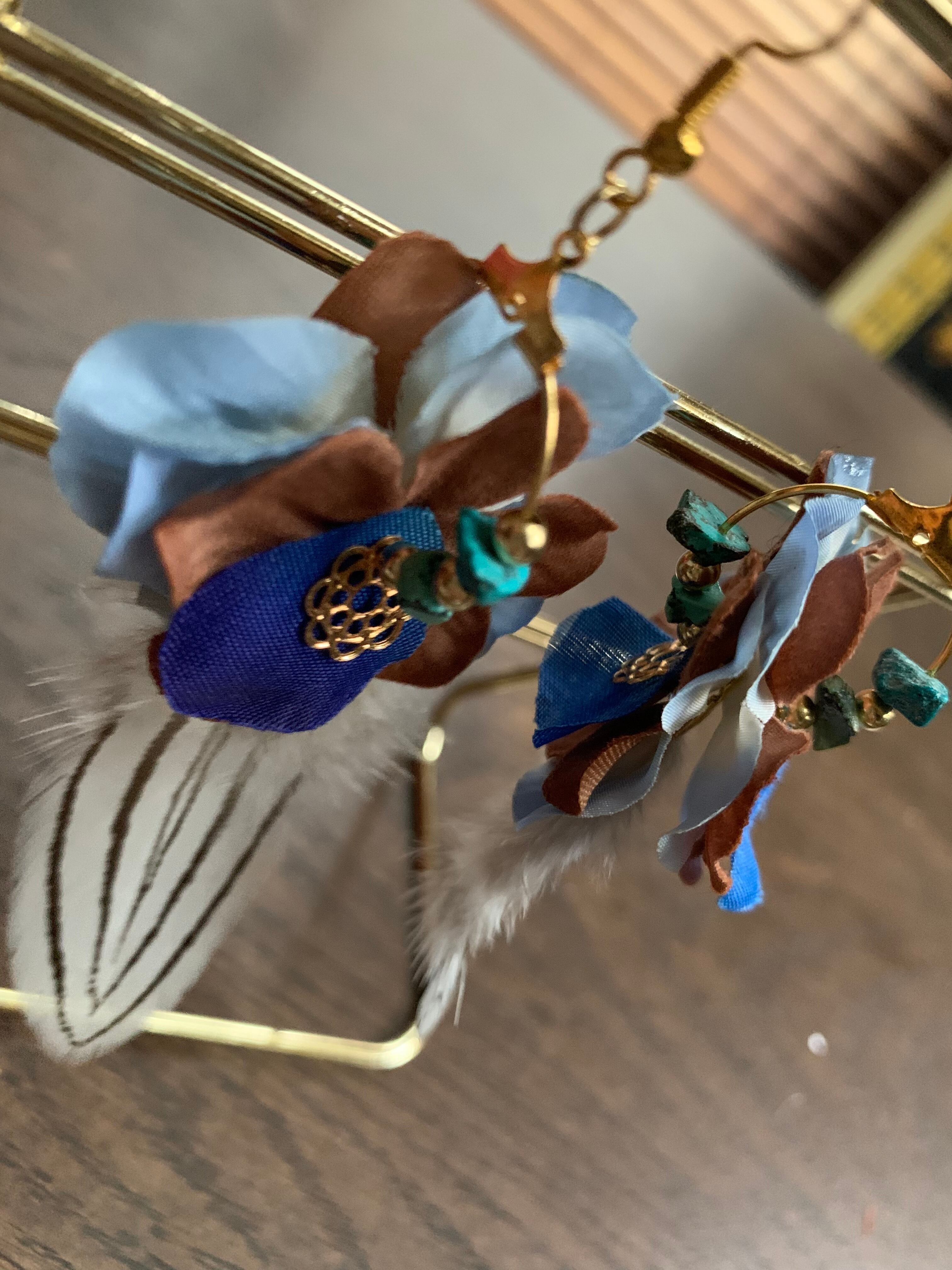 ブルー系とブラウンカラーのフラワーパーツ、透かしパーツ、ホワイトカラーにストライプの筋が入ったフェザーがアクセント。