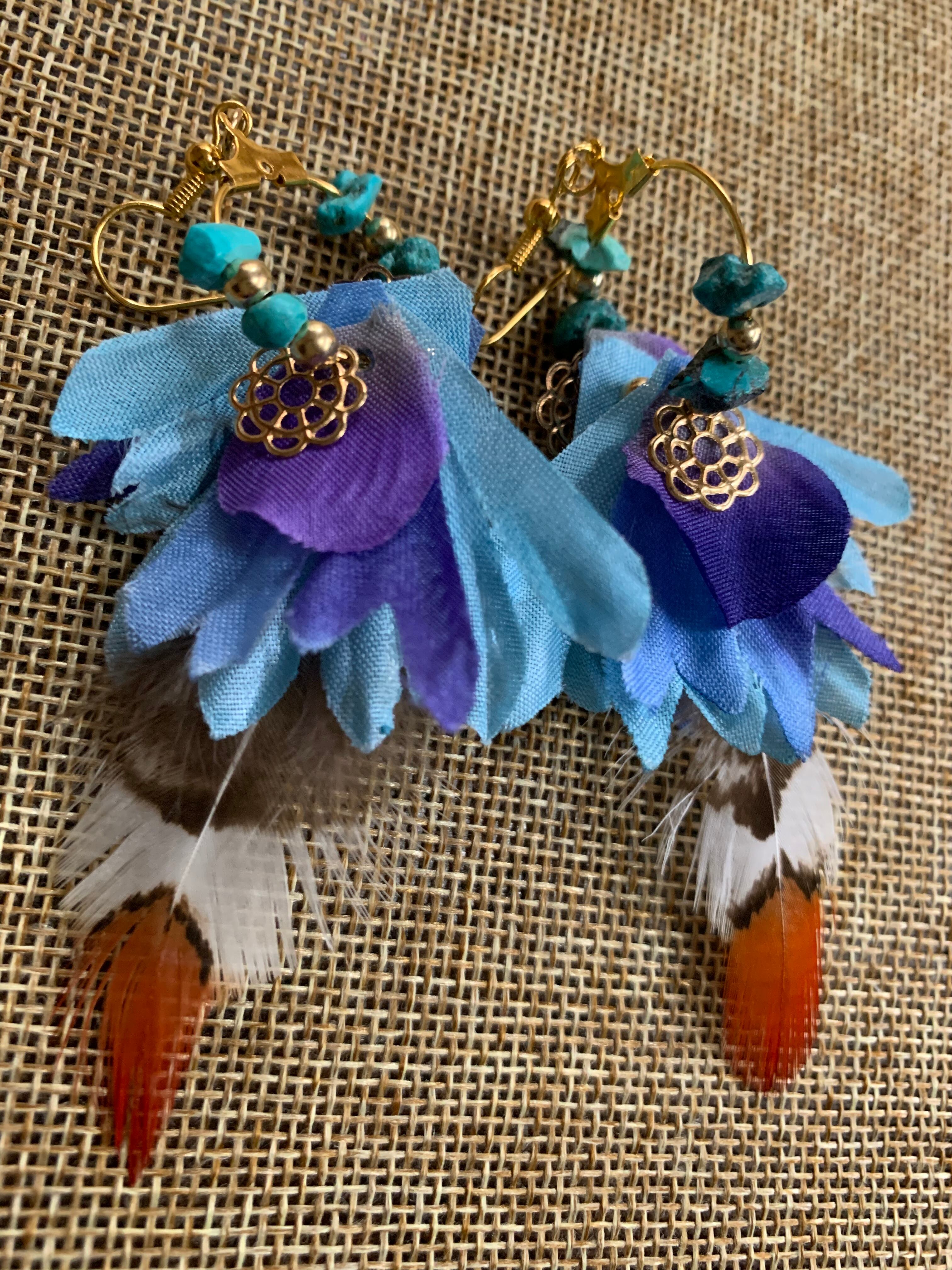 ブルー系とパープルカラーのフラワーパーツ、透かしパーツ、白、ブラウン、オレンジ系のフェザーがアクセント。