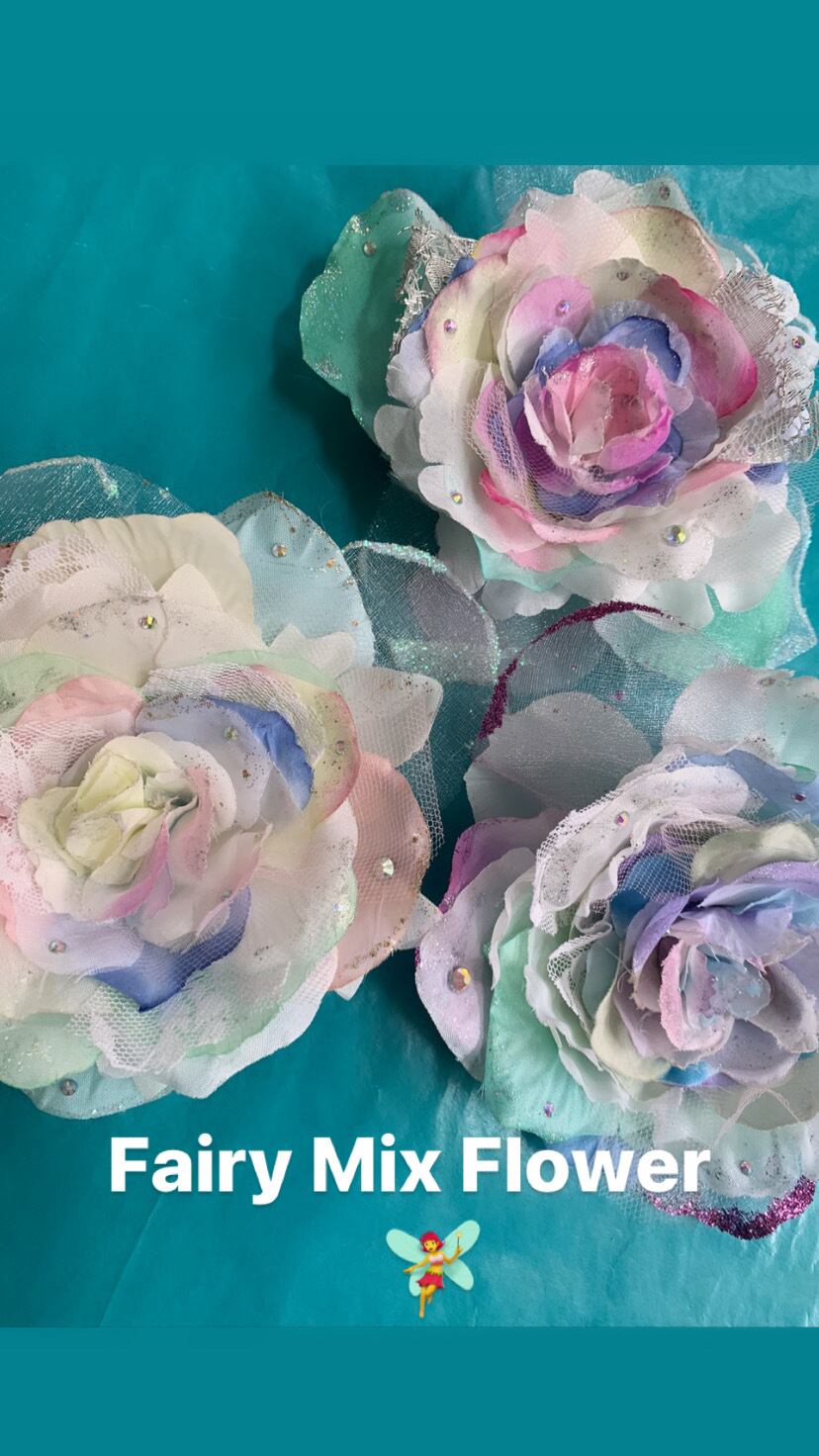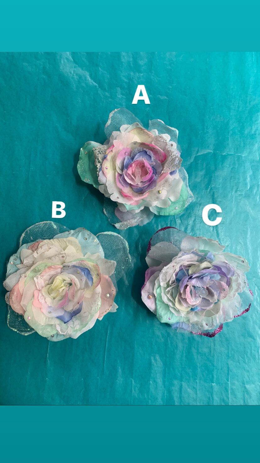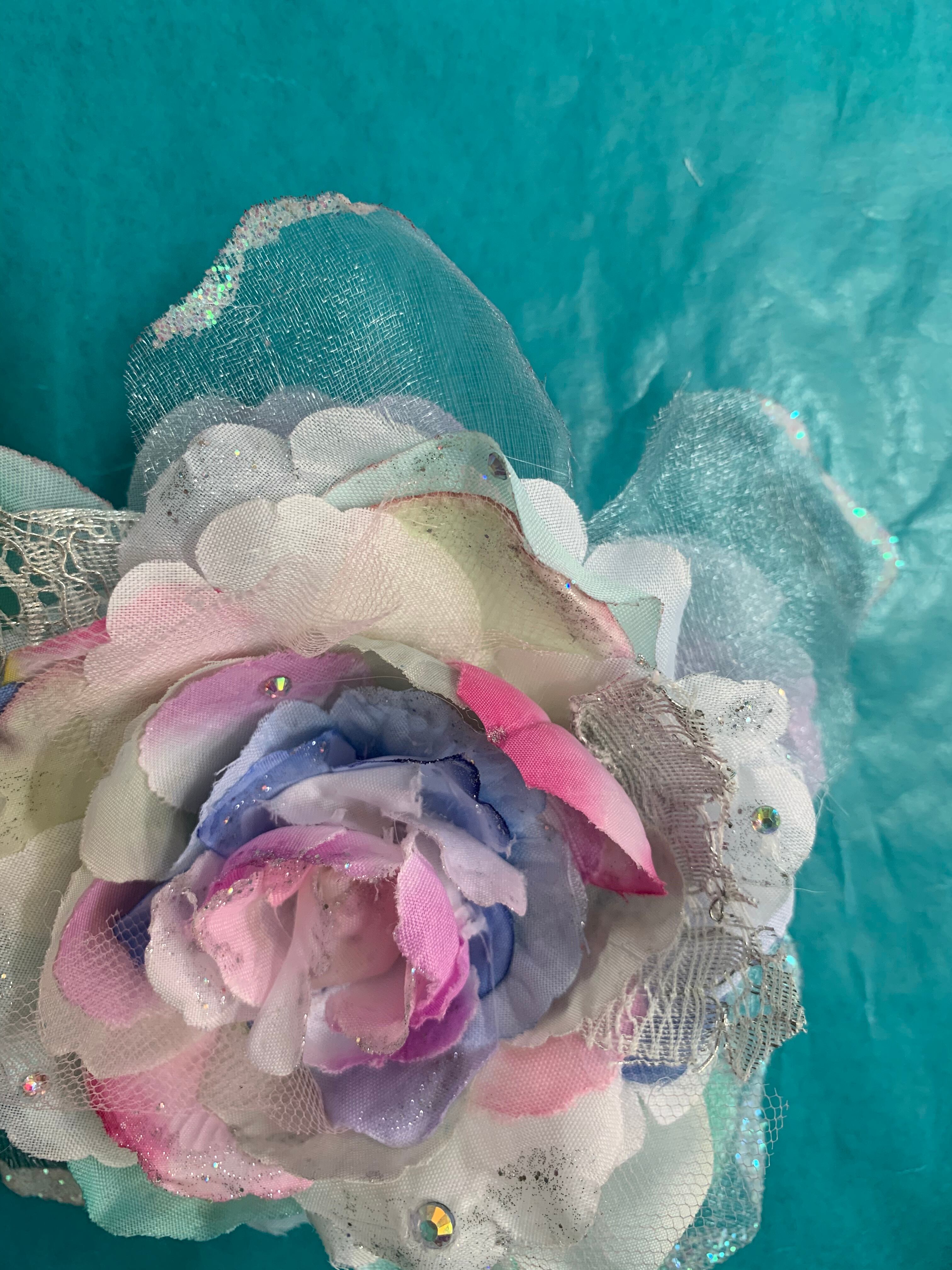 フラワーパーツ、オーガンジー、レース、チュール、ラメ、オーロラストーンを施して