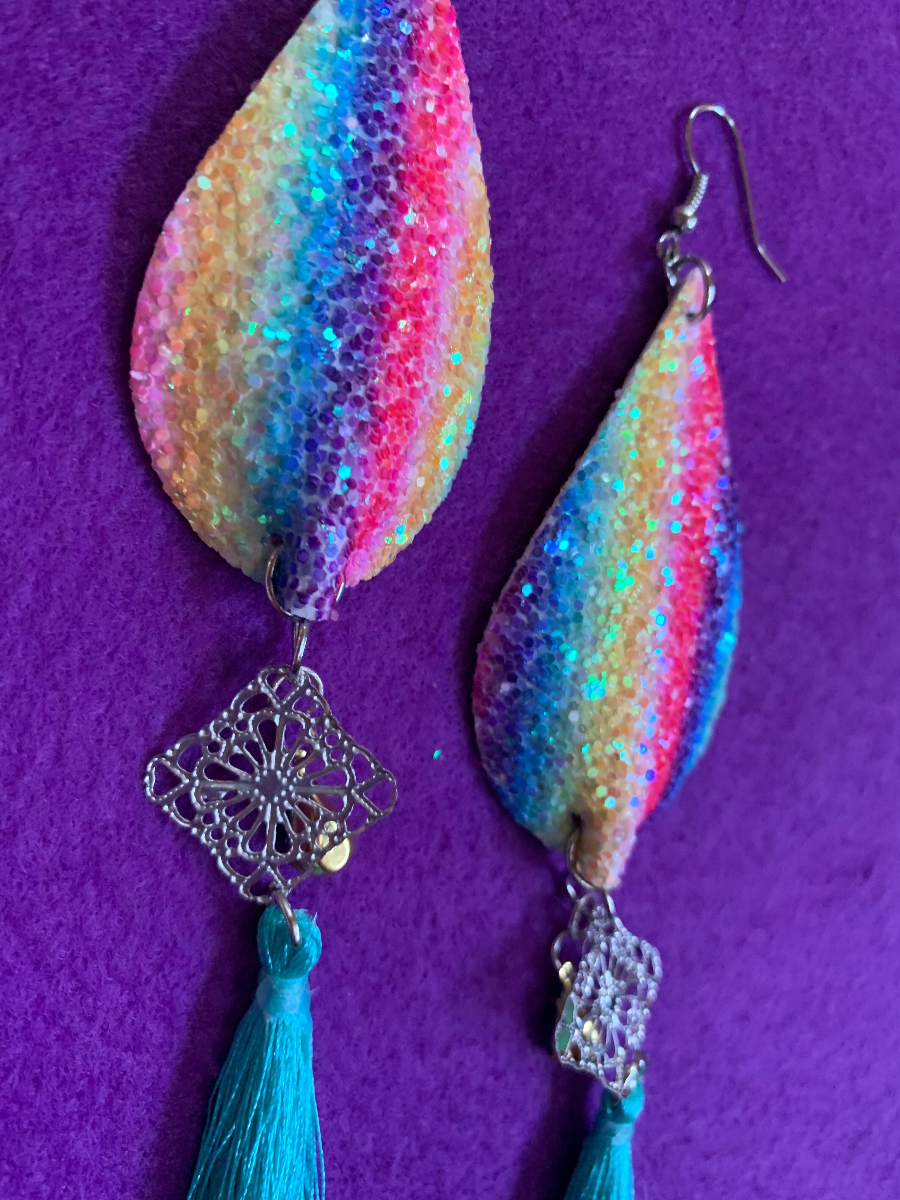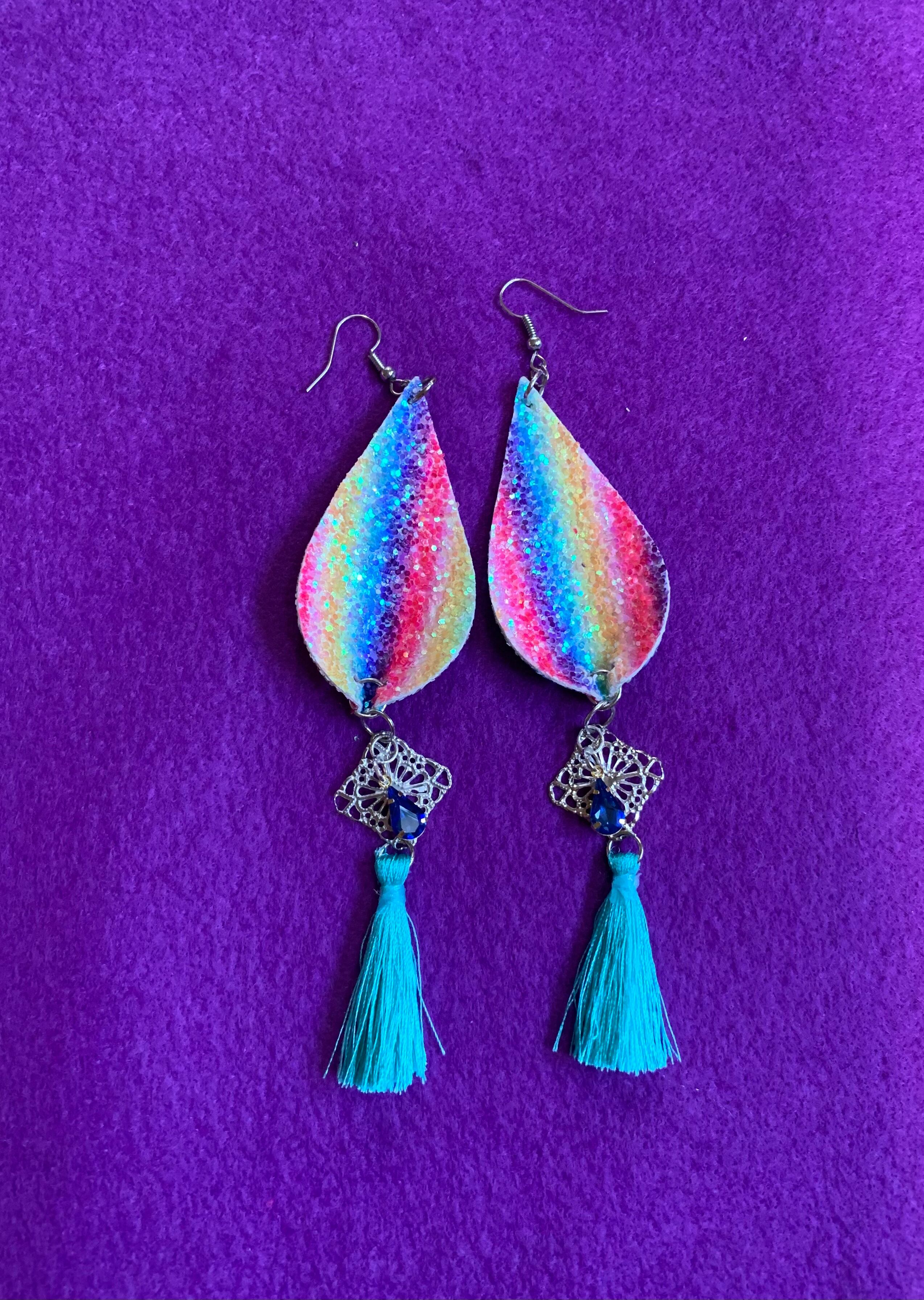 シルバーの透かしパーツとブルーの雫型パーツを重ねて、水色のタッセルを施して。