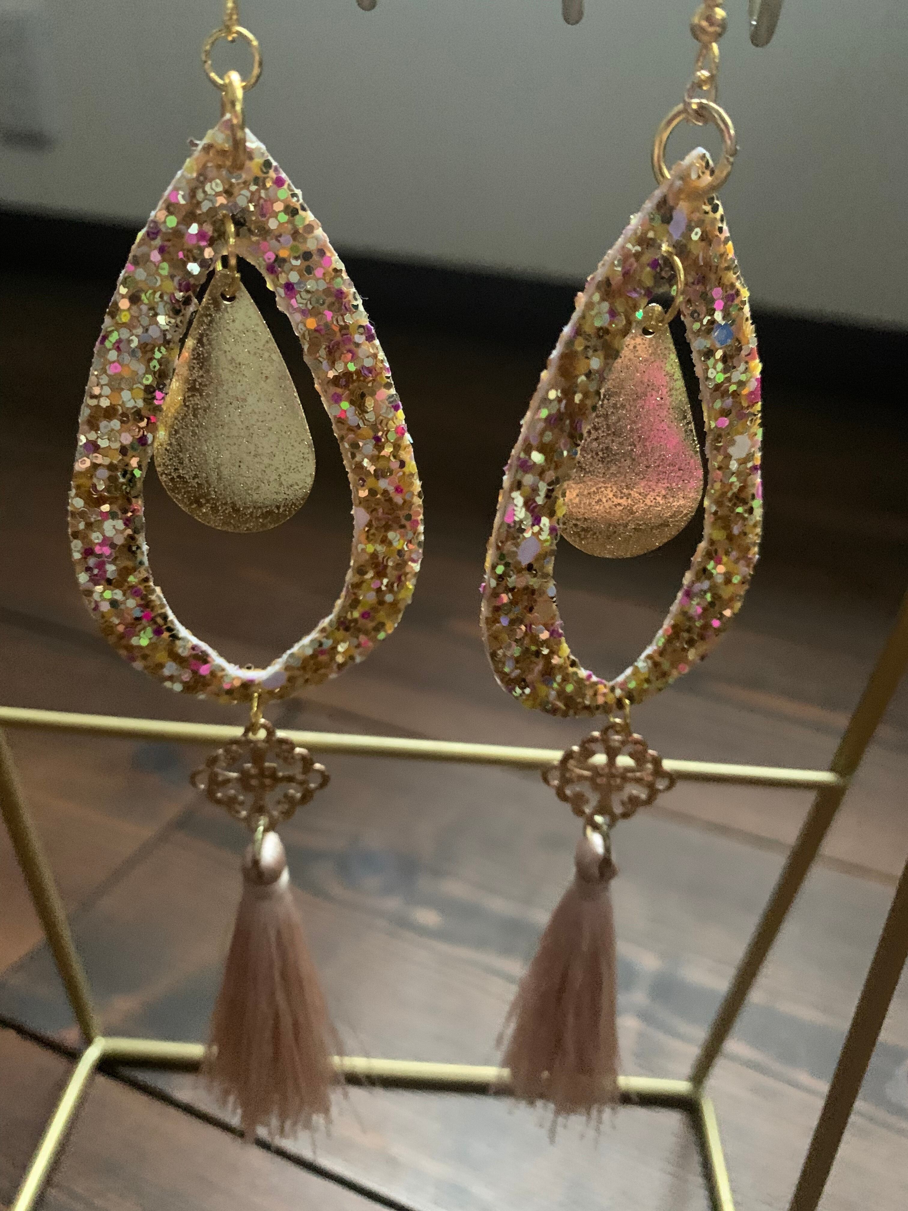 ゴールドの雫型パーツ、ゴールドの透かしスクエアのパーツに、ピンクベージュのタッセルを施して。