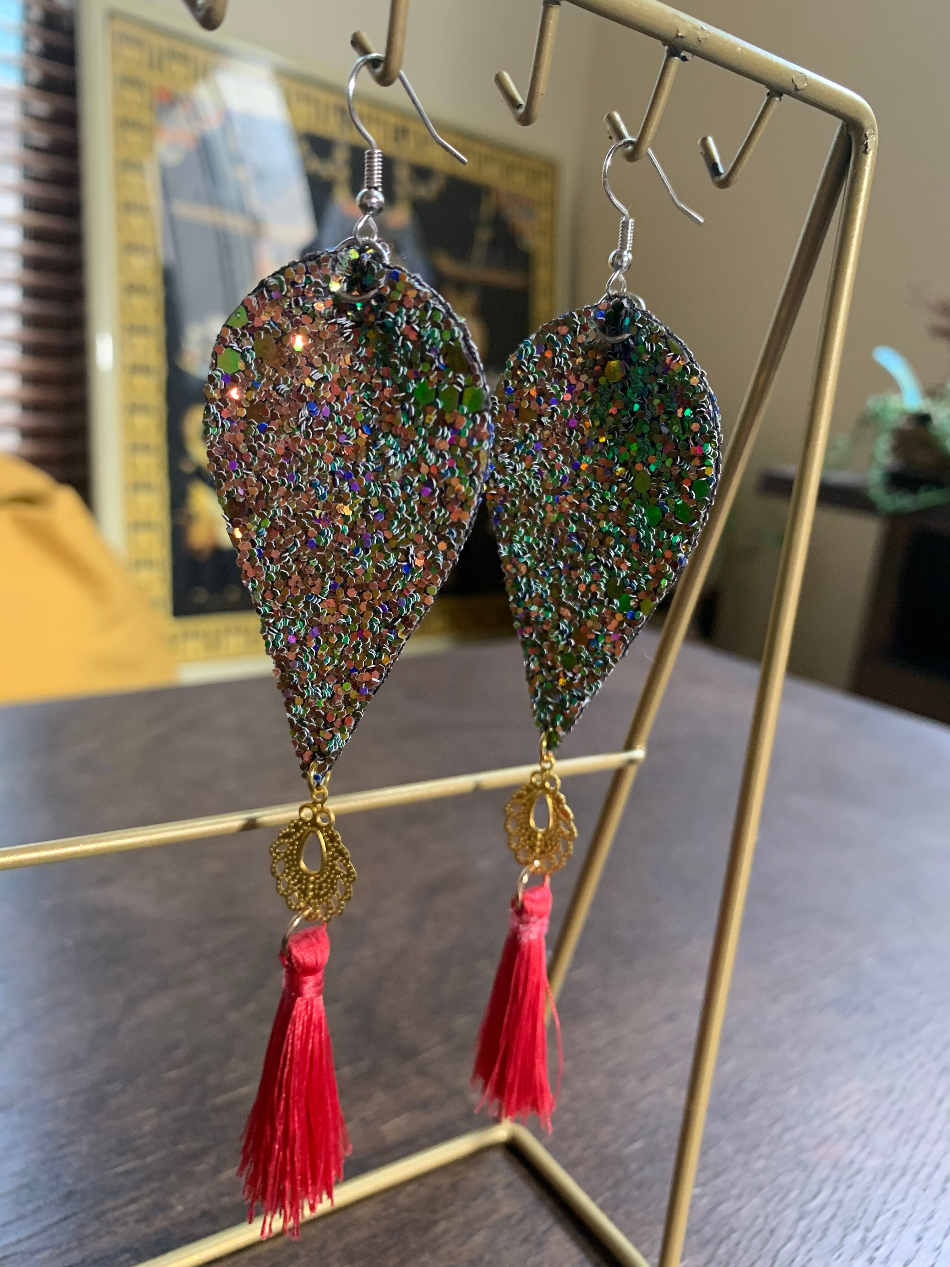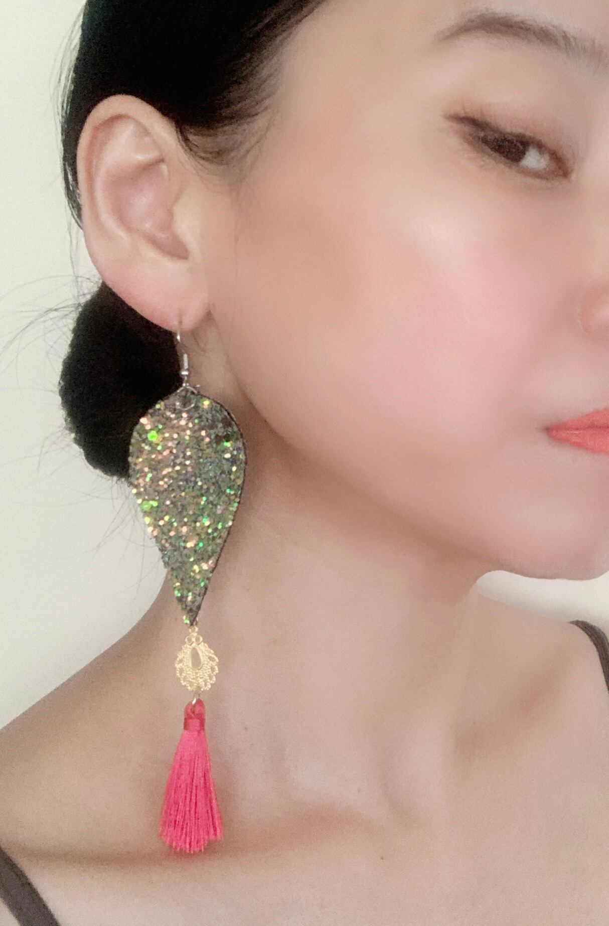 ゴールドのビンディ型透かしパーツとローズピンクのタッセルを施して