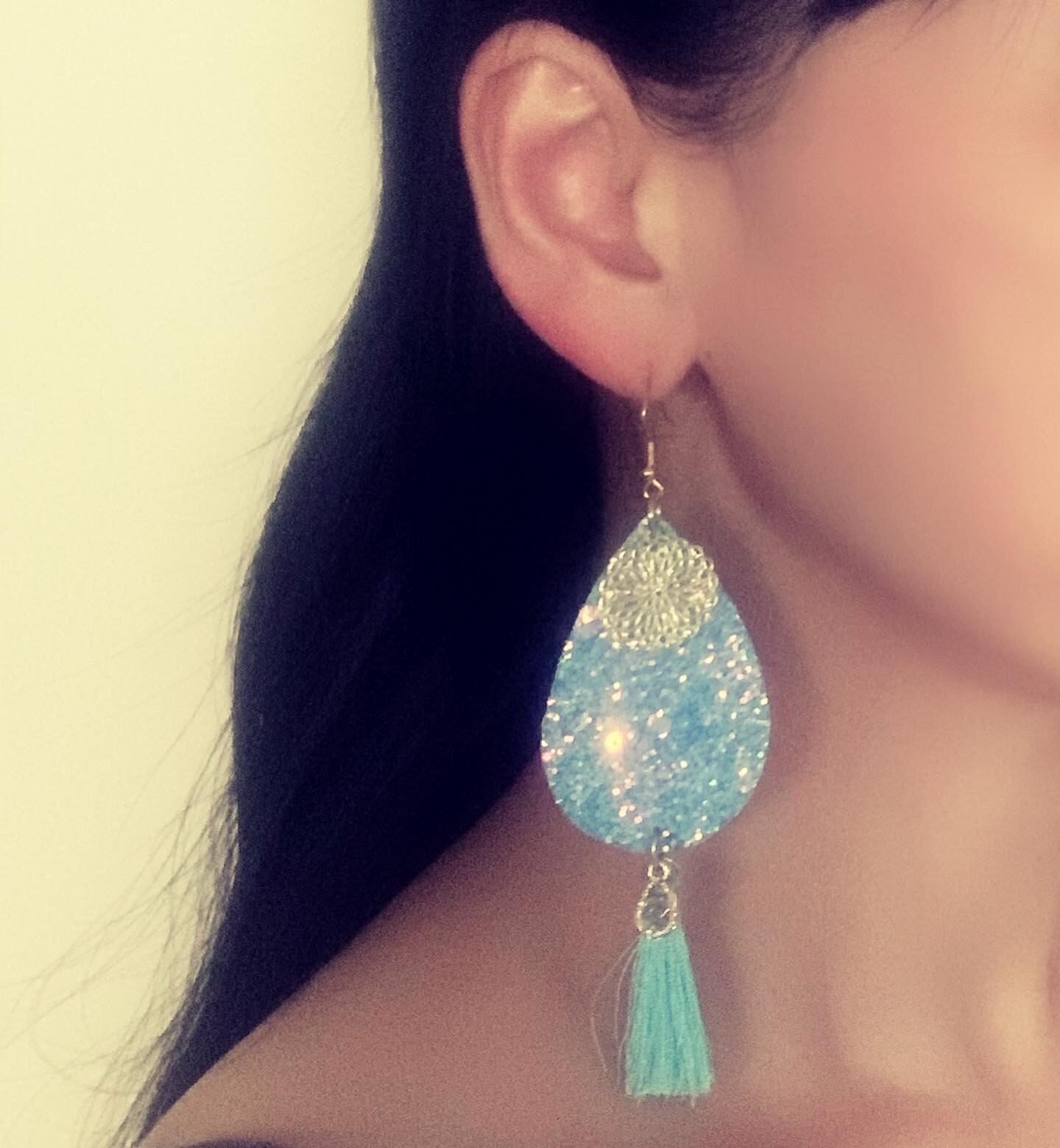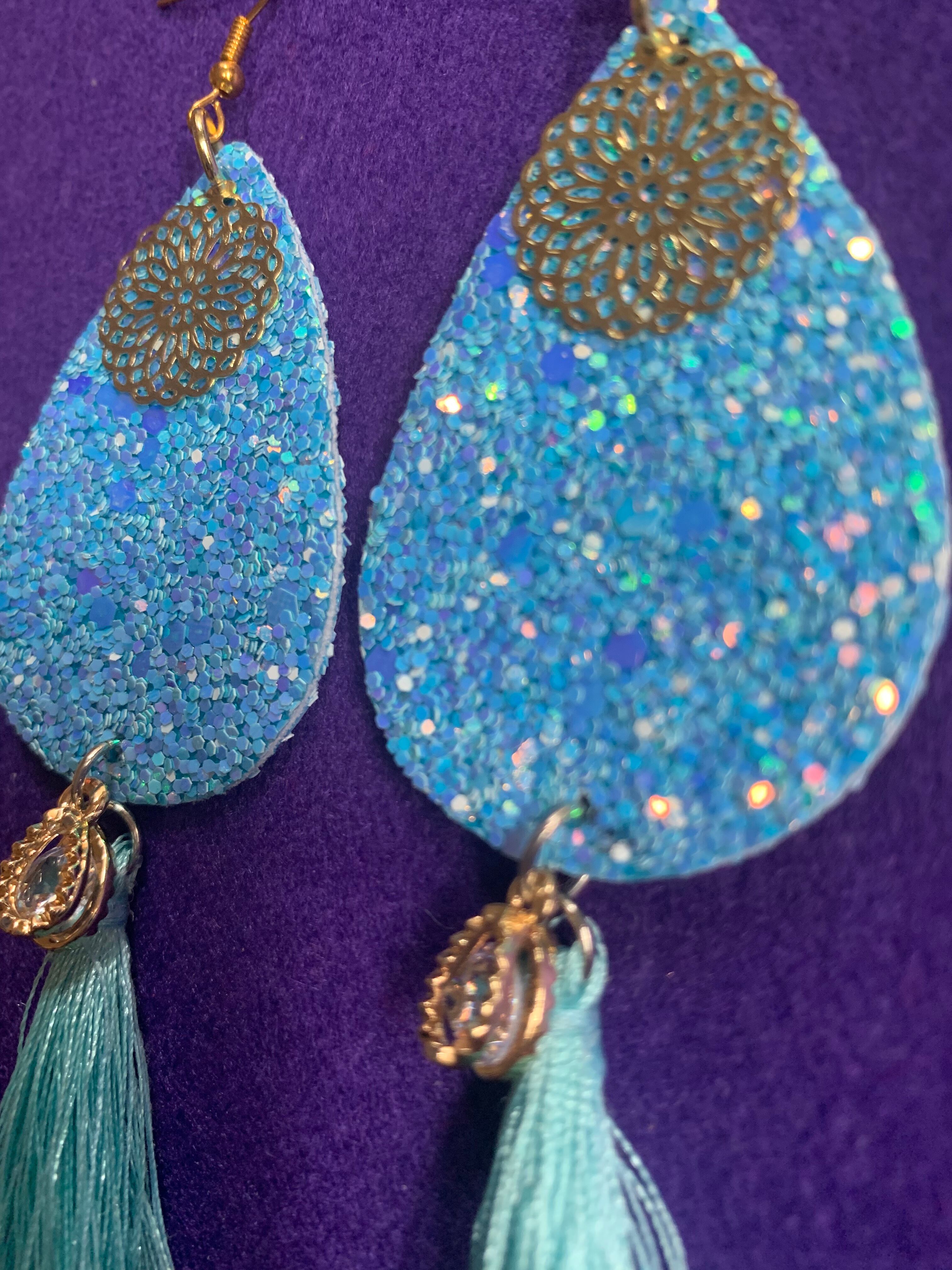 透かしサークルパーツに、下に水色タッセルと雫型ドロップパーツを施して