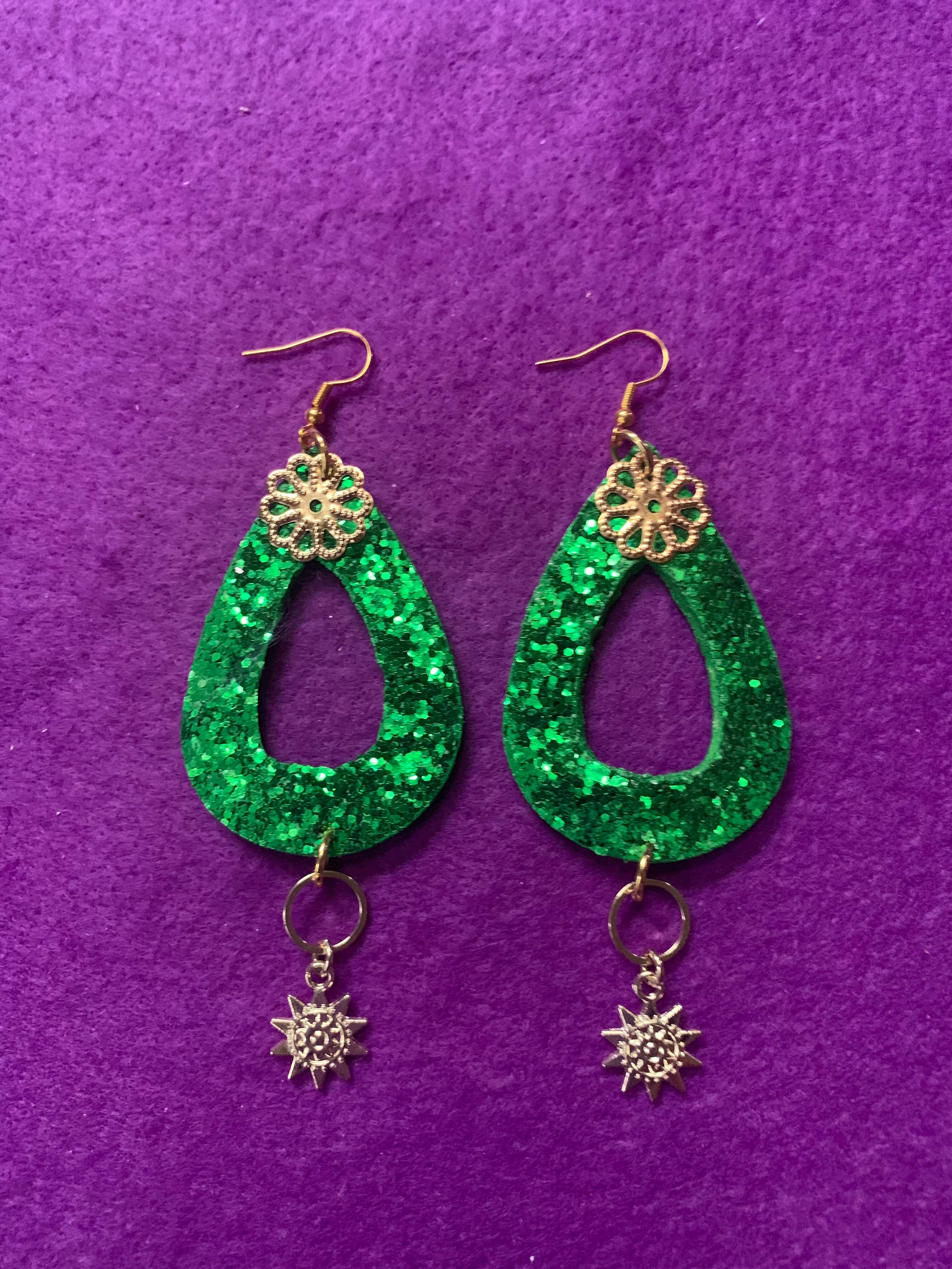 透かしサークルパーツに、下には太陽モチーフのチャーム。