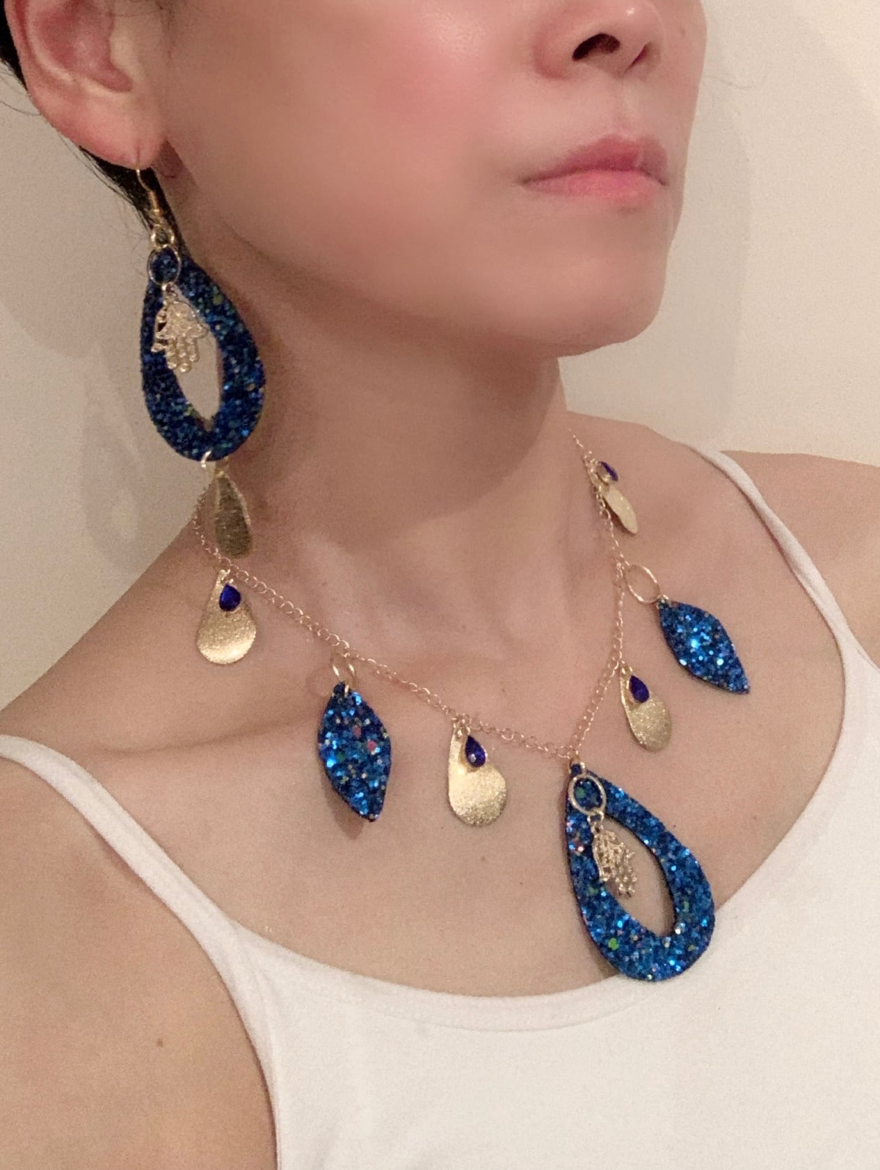 ゴールドの雫型チャーム縦長さ約2.5㎝、その上の重なる雫型ブルーチャーム縦長さ約8㎜