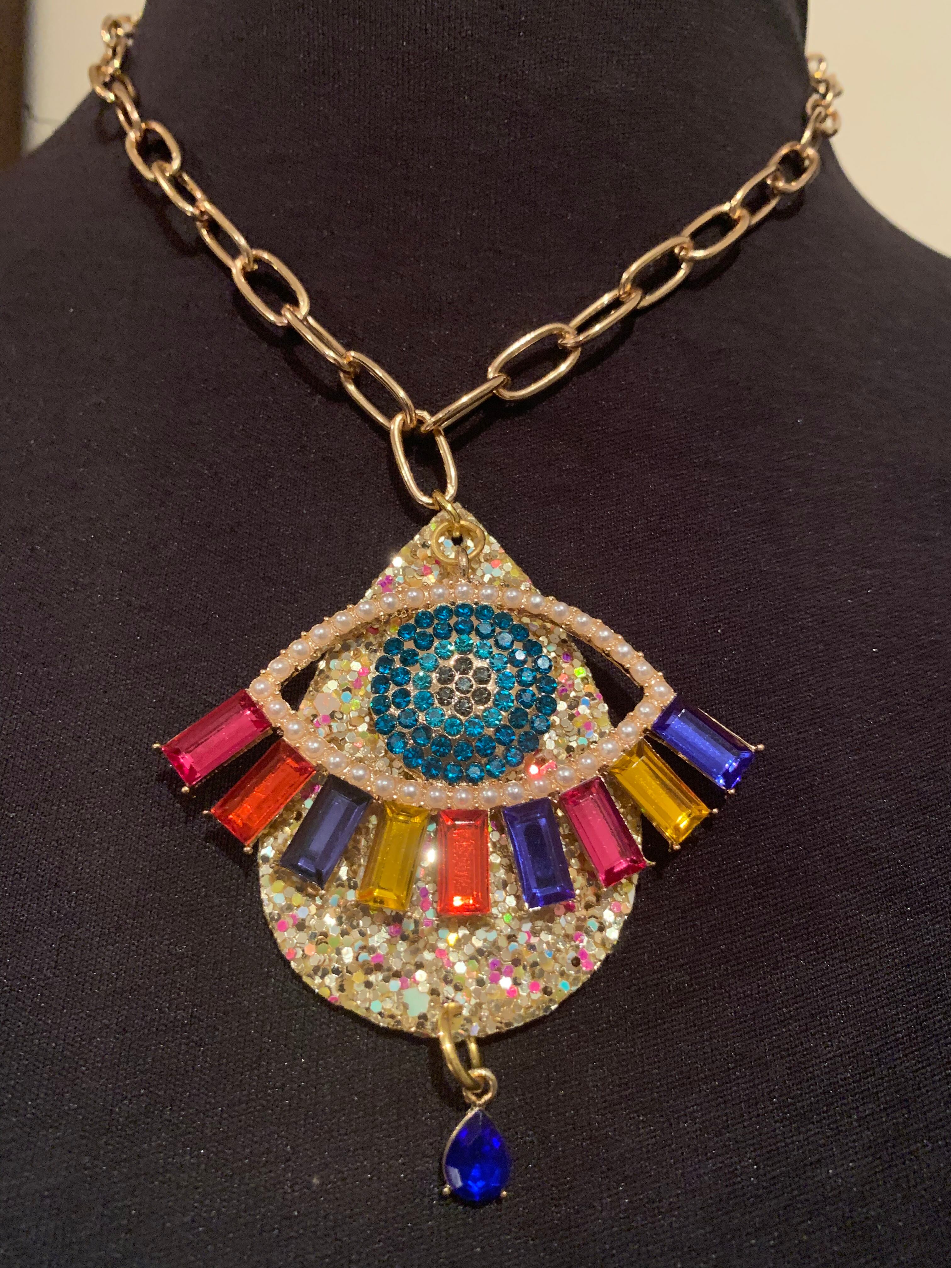 ネックレスはカラフルでポップで大きな目玉を。その下にブルーの雫型ドロップを施して。