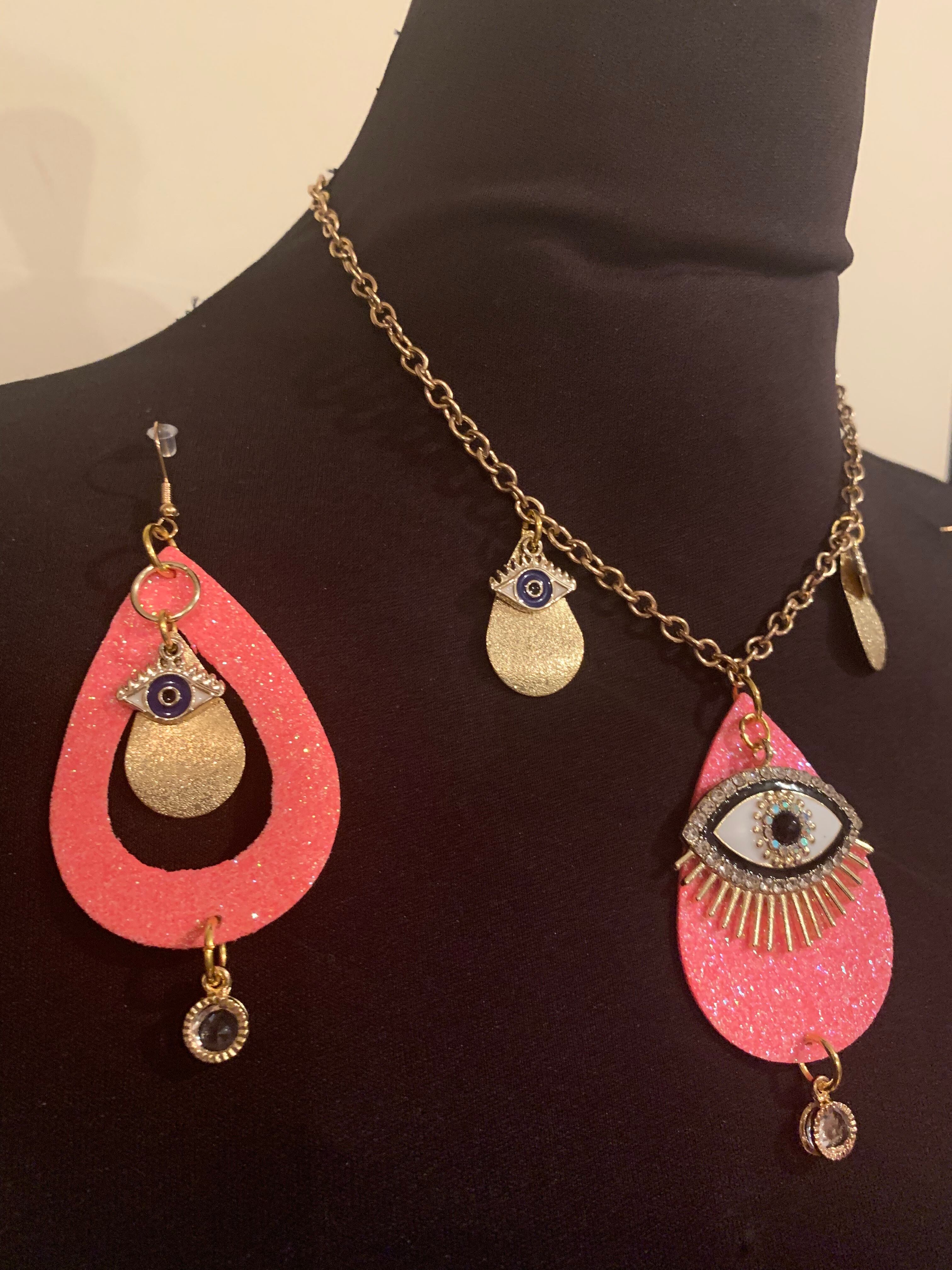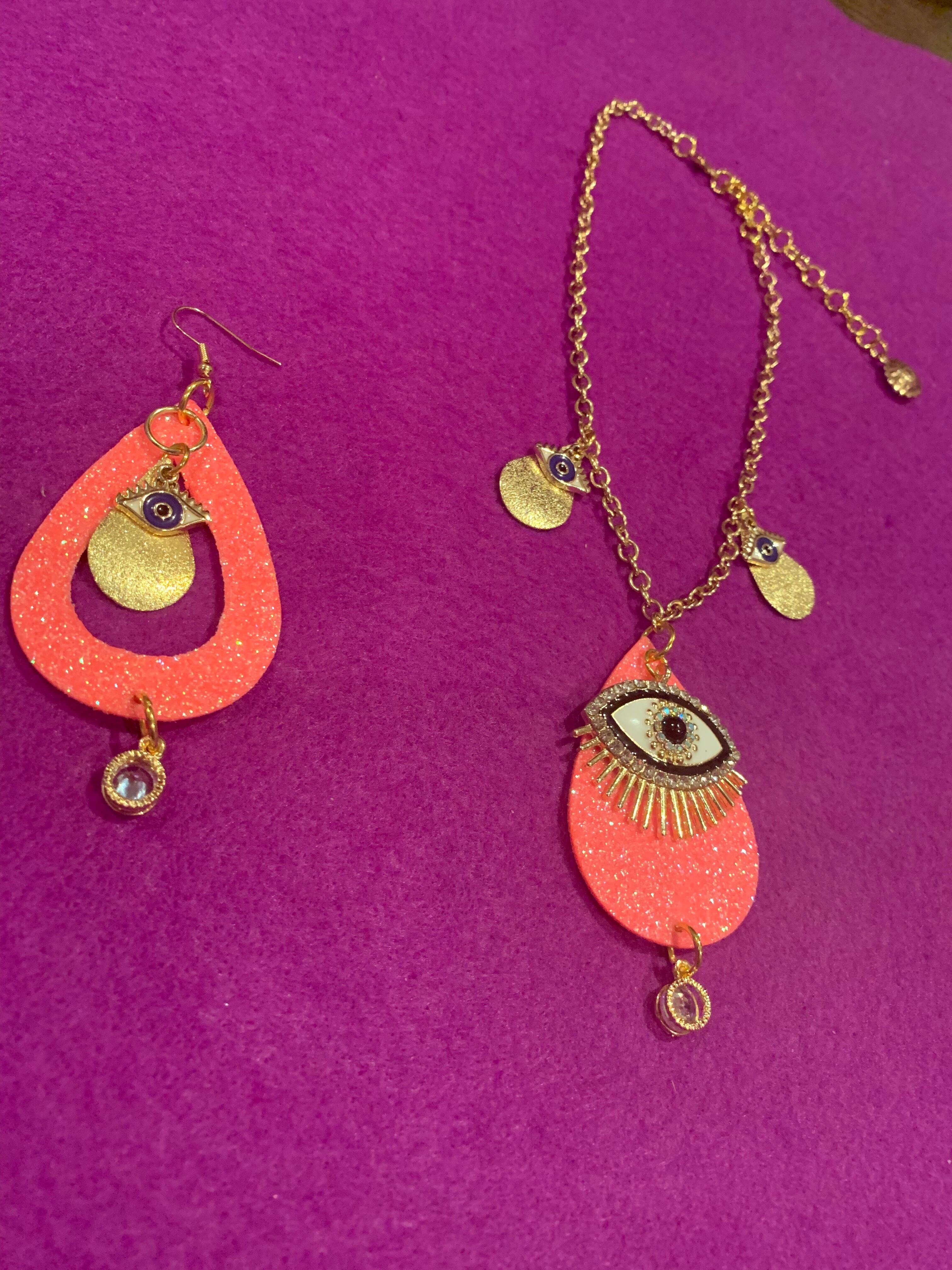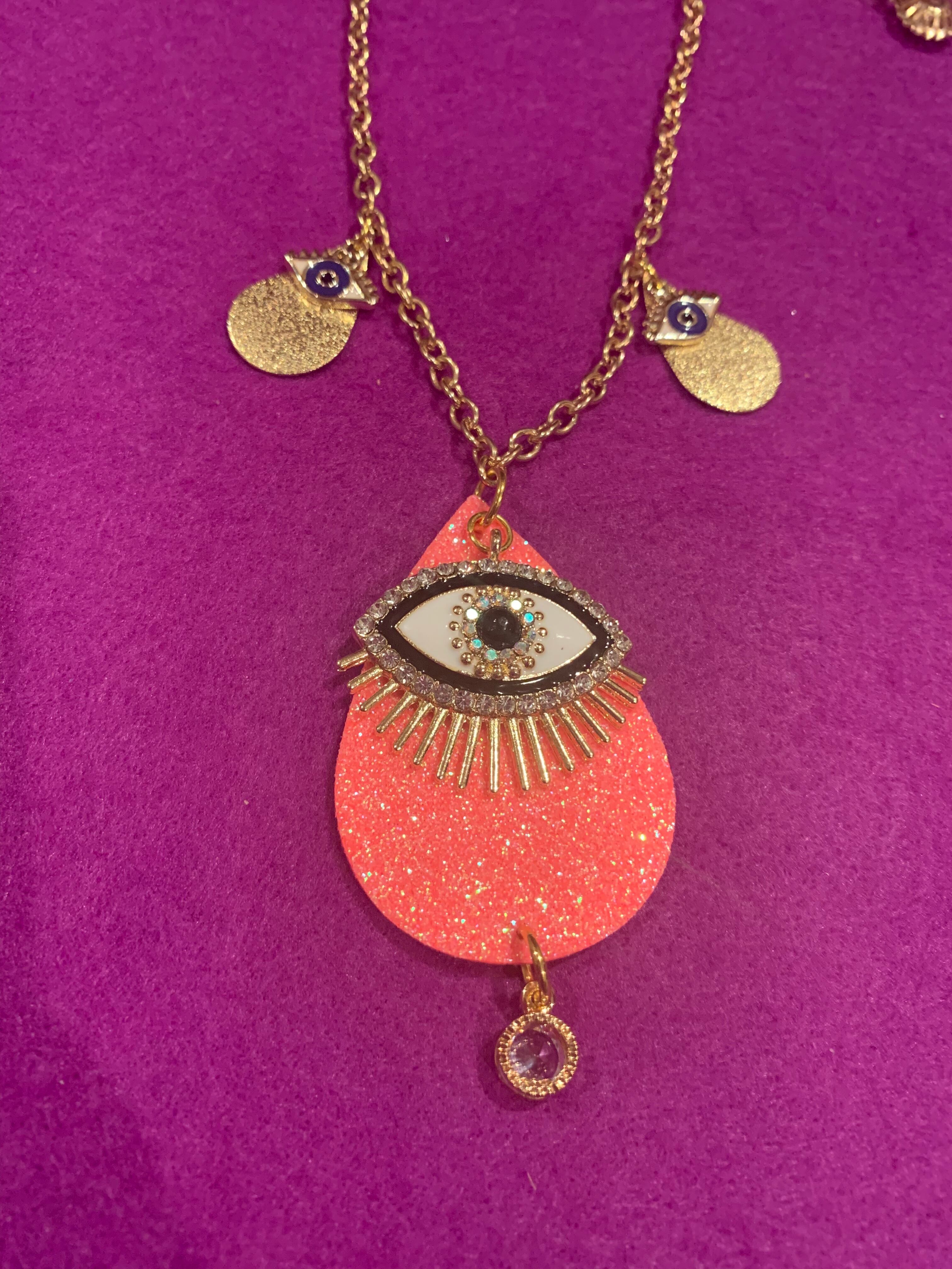 ネオンピンクカラーのキラメはラメが細かくキラキラ、ネックレスのキラキラお目目、お目目たくさんで目立つの間違いなし。