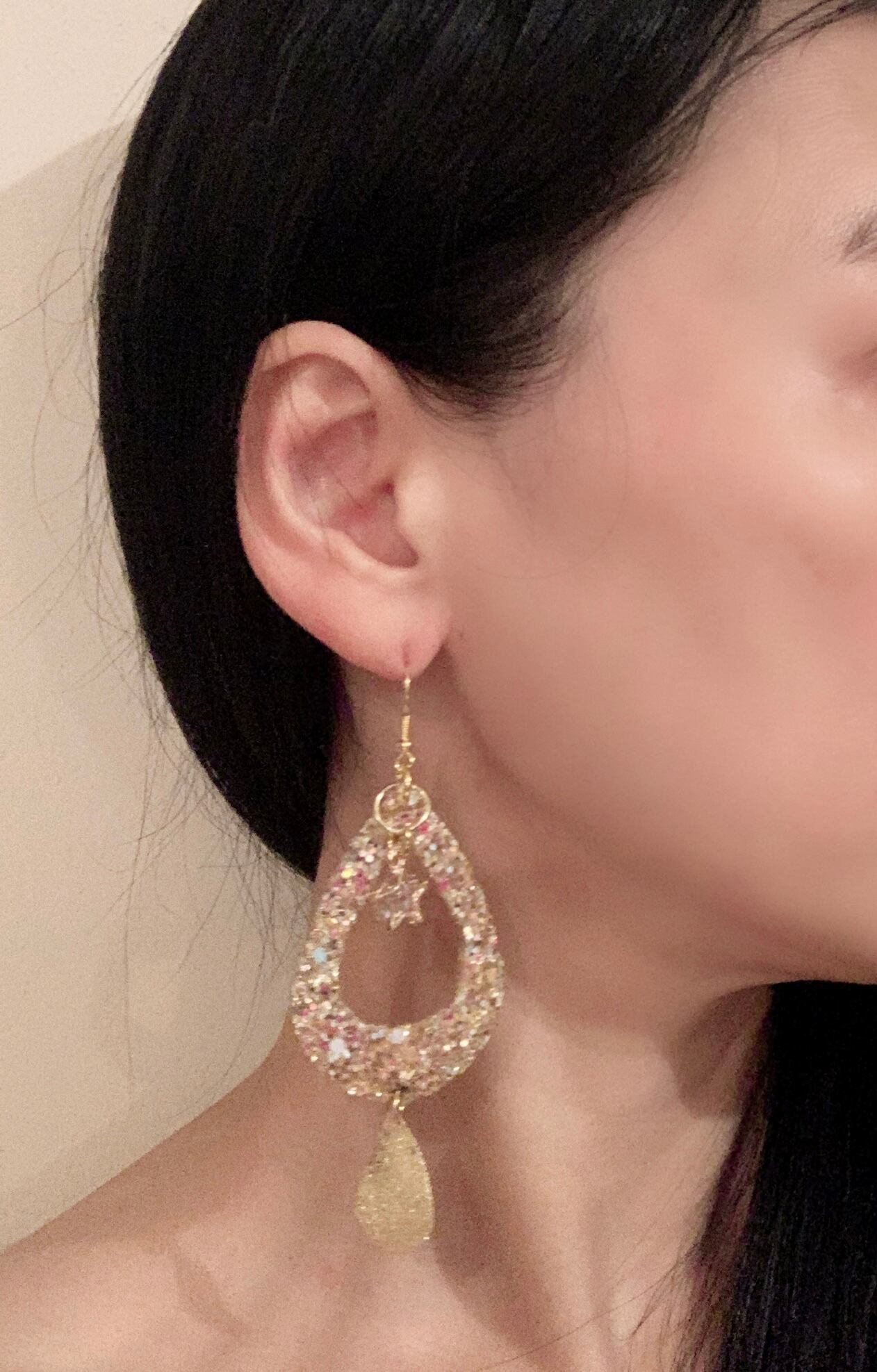 キラキラで大ぶりですがとても軽量で着け心地も良いです。