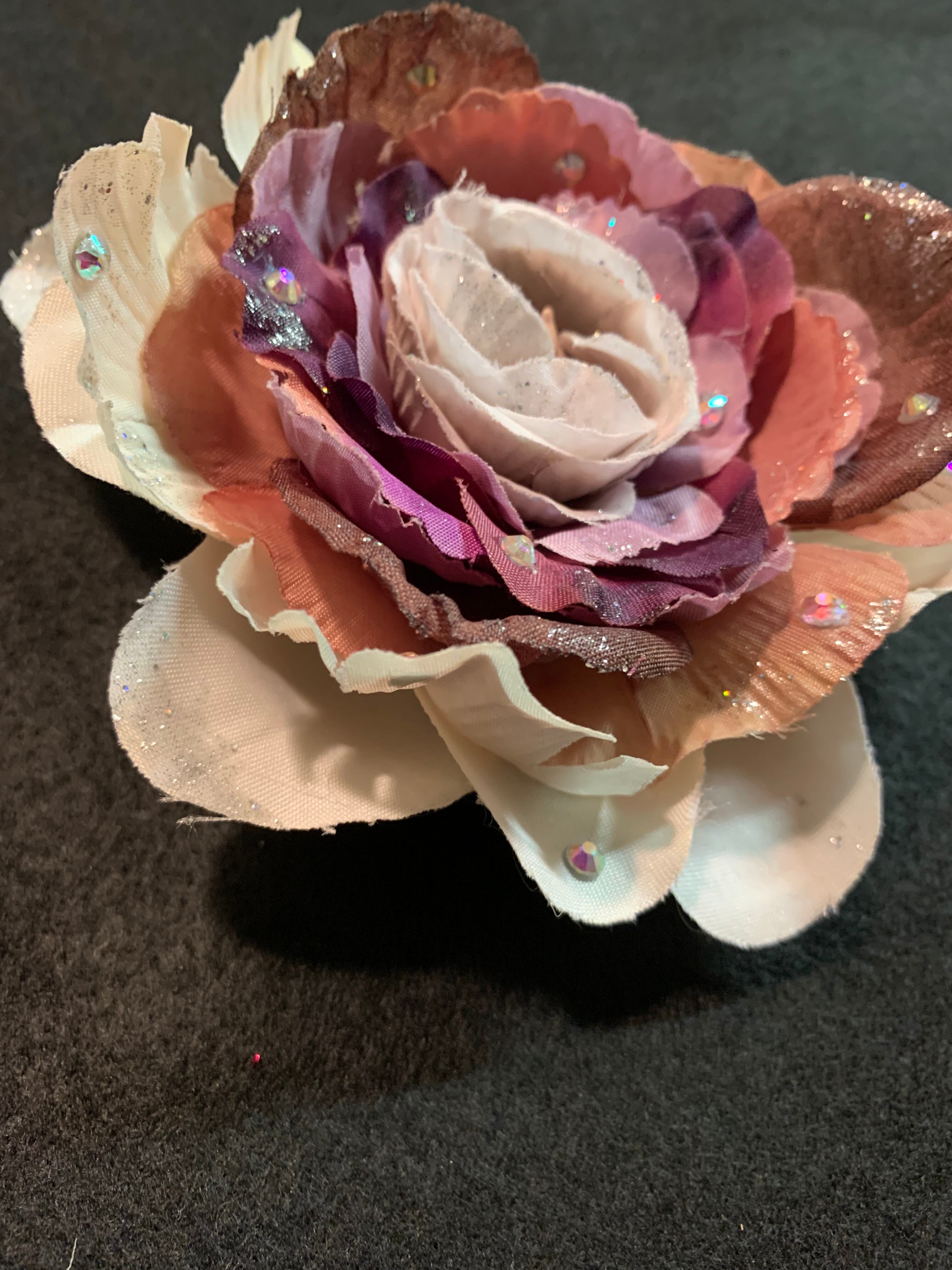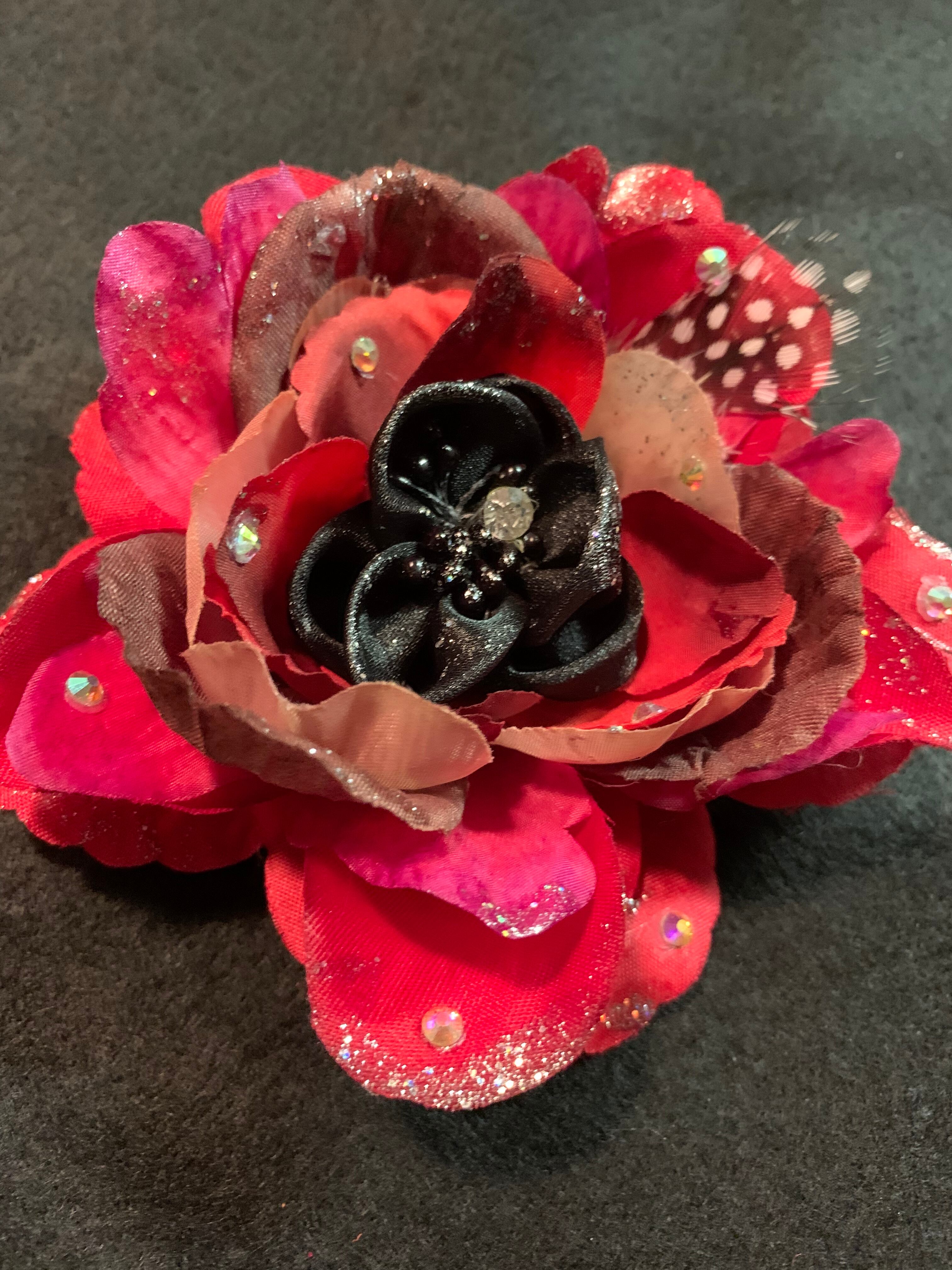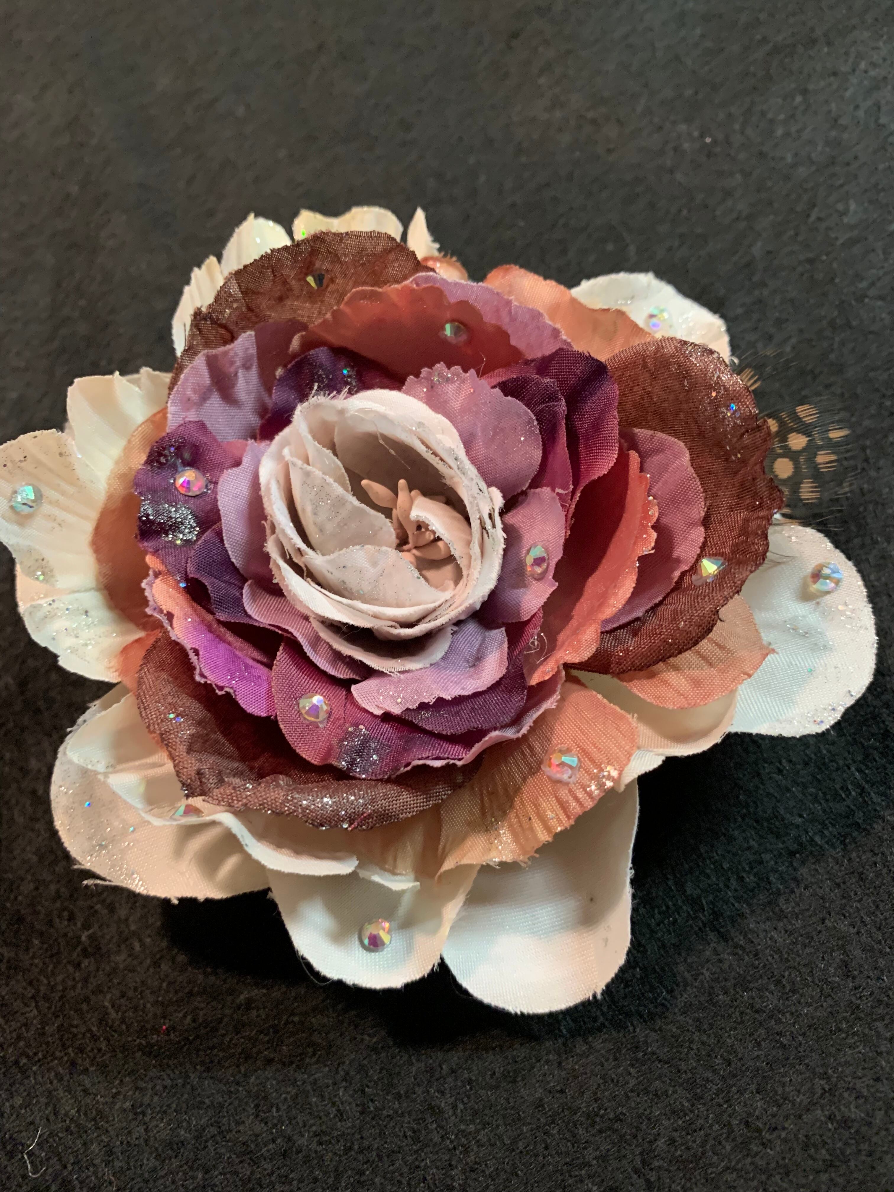 カラフルミックスのフラワーパーツのFlowerコサージュに、フェザーと、オーロラストーンとラメでキラキラりん☆