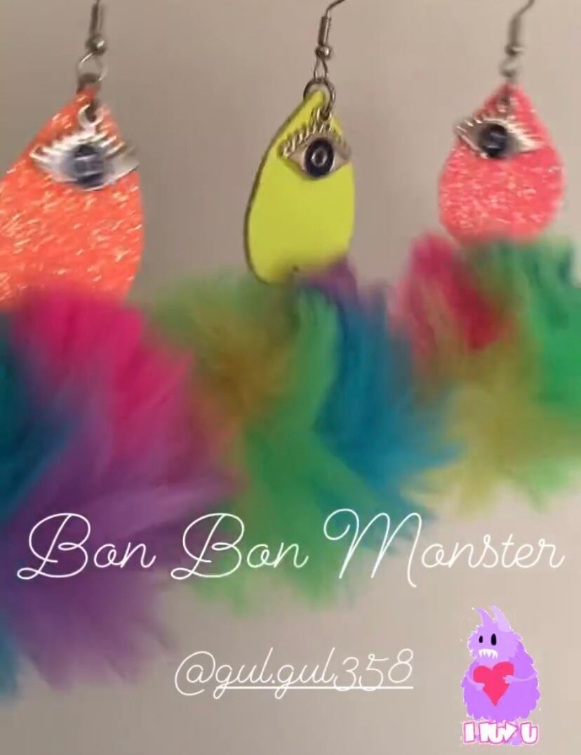 お目がついたネオンカラーの雫型パーツに大きなBon Bonは目立つの間違いなし。